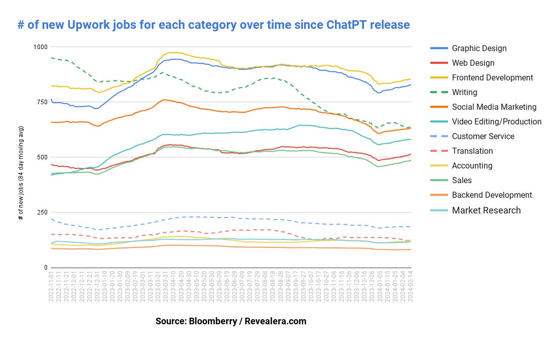 A study conducted between November 1, 2022, and February 14, 2024, utilizing data from the freelance hiring platform Upwork, identified three sectors experiencing significant declines: writing (down by 33%), translation (down by 19%), and customer service (down by 16%).