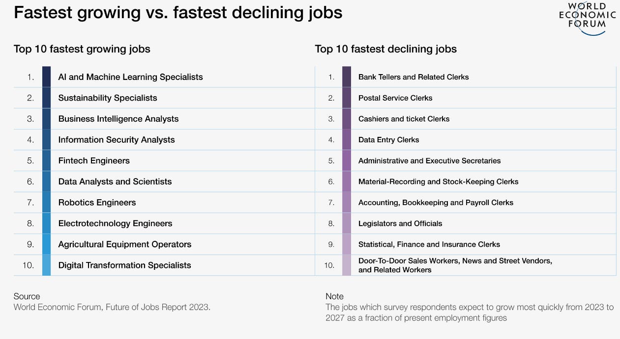 A report by the World Economic Forum released on May 1, 2023, lists the fastest-growing and declining jobs: